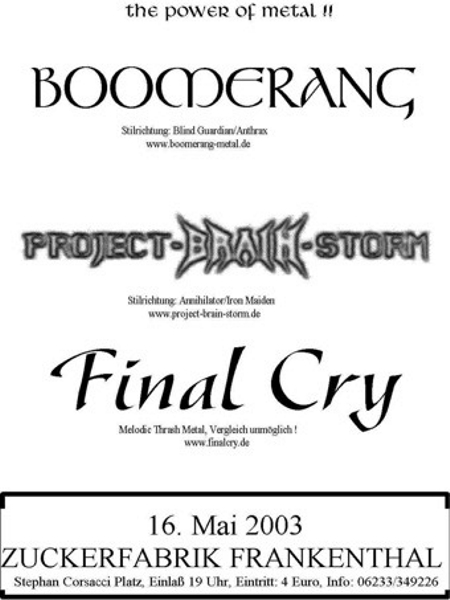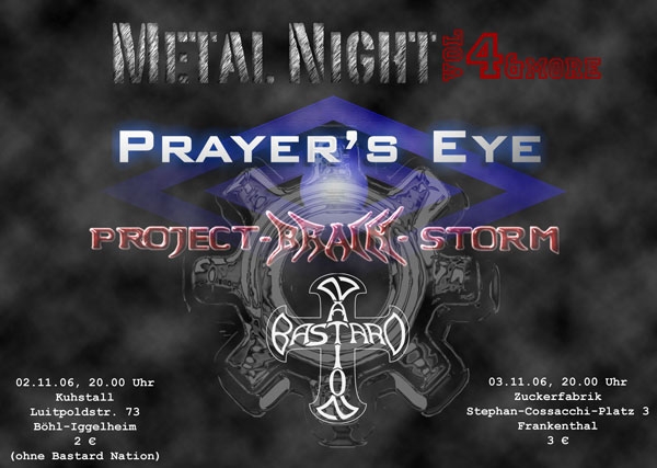 15.10.10 | "Halle 101" Speyer | Primal Fear, Dezperadoz, Marya Roxx, (wir) | http://www.jayjay-concerts.de Eintritt: 20,50 Euro, Vorverkauf unter andreas@project-brain-storm.de oder ilja@project-brain-storm.de Konzertbericht |