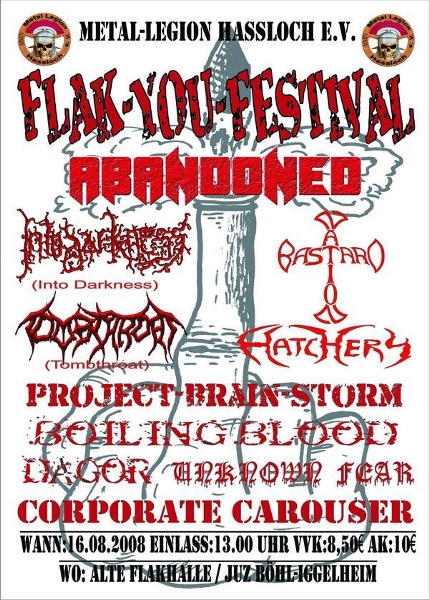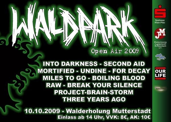 09.10.10 | "Walderholung" Mutterstadt | Hatchery, For Decay, Lethe, Spheron, All fucked up, Pete Mosh, Painsaw, (wir), Manifestation, Zombieslut | Waldpark Open Air http://www.waldpark-openair.de/ Vorverkaufskarten für 8 Euro unter ilja@project-brain-storm.de statt Abendkasse 10 Euro! |