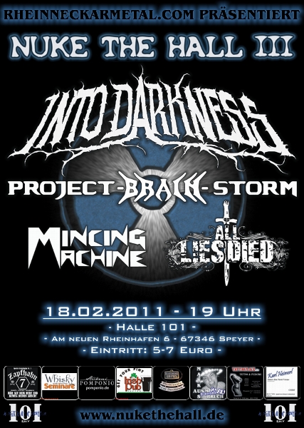 18.02.11 | "Halle 101" Speyer | Into Darkness, (Wir), Mincing Machine, All Lies Died | NUKE THE HALL III www.nukethehall.de www.myspace.com/nukethehallspeyer Eintritt 7 Euro Abendkasse / 6 Euro Reservierung / 5 Euro Vorverkauf (ab 01.01.11.) |