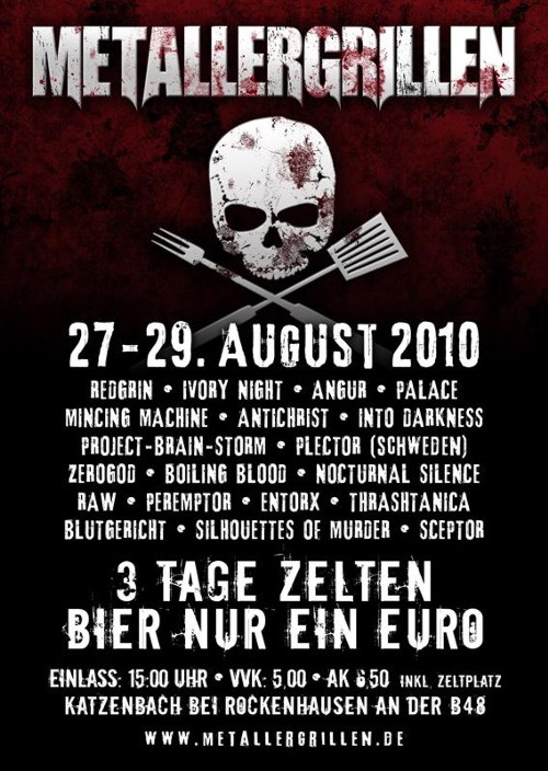 27.08.10 | "Metallergrillen" Katzenbach | Redgrin, Ashes of Decay, Angur, Palace, Mincing Machine, Antichrist, Lamera, (wir), Plector, Zerogod, Boiling Blood, Nocturnal Silence, Raw, Entorx, Thrashtanica, Blutgericht, Into Darkness, Sceptor |