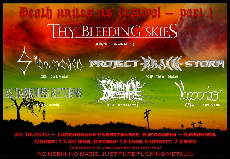 30.10.10 | "Death Unites us" Bietigheim | As Darkness Returns, Thy Bleeding Skies, Stahlmagen, (wir), Vaporizer | Weitere Infos folgen | Fotos |